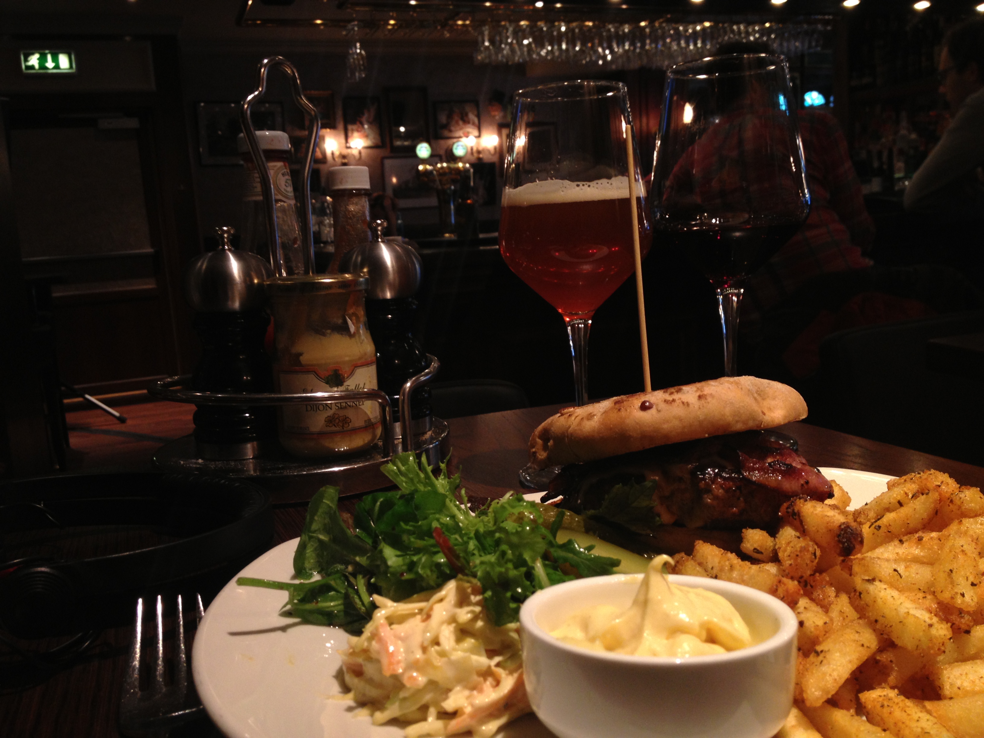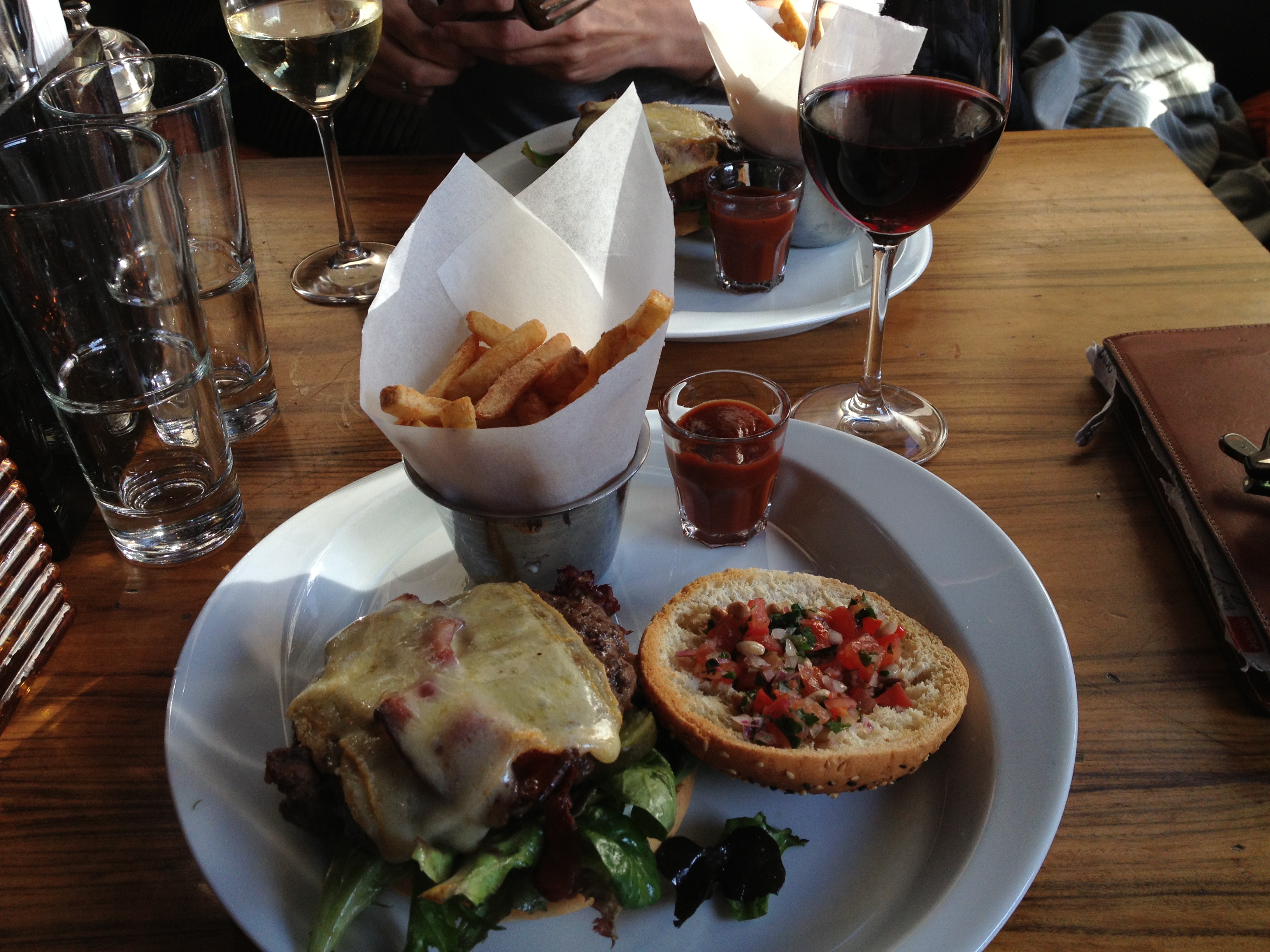 The Brokers hamburgare. Till den en IPA och ett glas Chianti som sommelieren Helene valde ut. Fruktigheten i vinet mötte sältan i hamburgaren på ett alldeles utomordentligt vis.